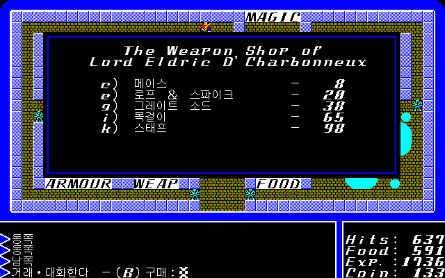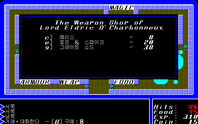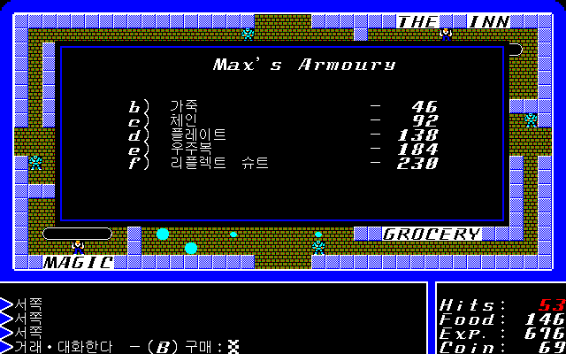 대부분의 게임에서도 그렇듯, 롤플레잉 게임, 특히나 울티마에서는 일단 생존이 가장 먼저죠. 무기로 메이스를 사서 장비했다고는 하지만 아직 던전 탐험은 무리더군요,