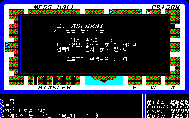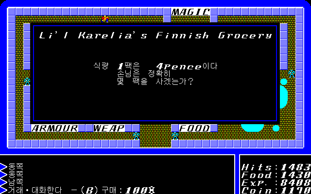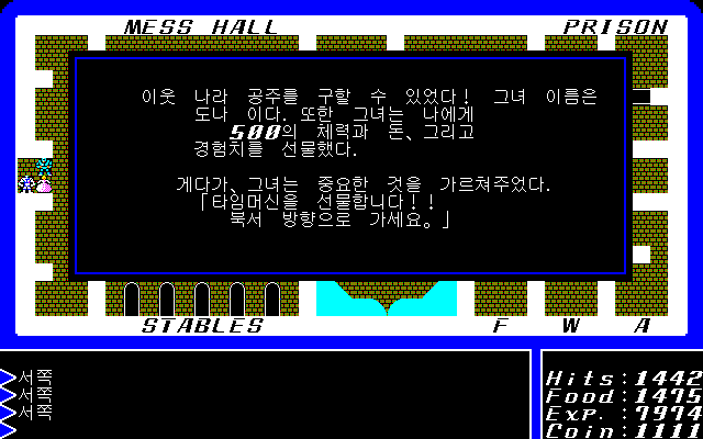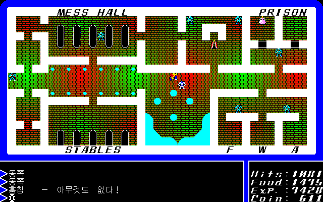 슬슬 이제 더 에너지 장이 골치아파집니다. 깊이 내려갈수록 저 에너지 장에 가로막혀 갈 수 없는 곳이 많아지는데, 저 에너지 장을 제거하는 마법을 취급하는 마을이 생각보다 찾기 어렵더군요. 올라가기, 내려가기 마법이 있긴 하지만 그 마법은 편리한 대신 길이 없는 곳으로 잘못 내려갔다간 사방이 막힌 곳에 갇히고 맙니다. 도로 올라가기 마법을 쓰지 않으면 죽음이죠. 울티마 5편의 지하세계에서 In Por 마법의 공포가 떠오릅니다.