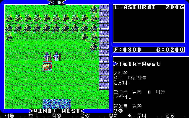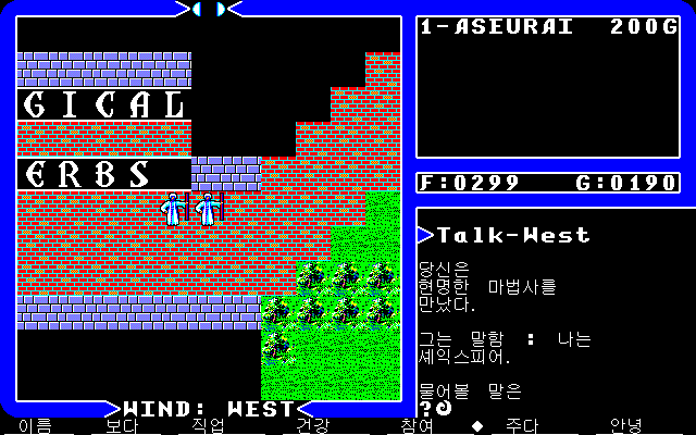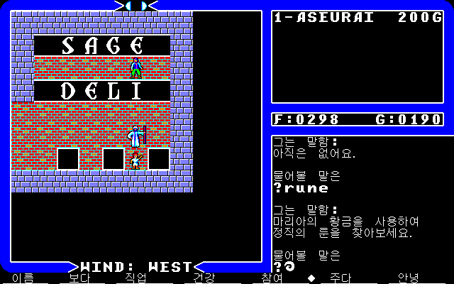 사실 그동안 울티마를 수도 없이 플레이하며 아바타의 역할은 거의 언제나 마법사로 정해져 있었습니다. 6편부터 동료들도 자동으로 인공지능으로 싸워주기는 하지만 역시 한계가 있는지 접근전이나 무기공격은 잘 해도 마법은 정말 못 다루더군요. 마법을 잘 쓰는 동료를 만들려고 그렇게 노력했지만 늘 삽질하는 동료에, 게다가 6편에서는 아바타의 비해 효율이 절반밖에 안되는 마력때문에 결국 좌절하고 말았지요. 그러다보니 항상 동료에게 근접전, 원거리전 무기 공격을 맡기고 저는 마법을 담당하는 파티 구성이 되었습니다.