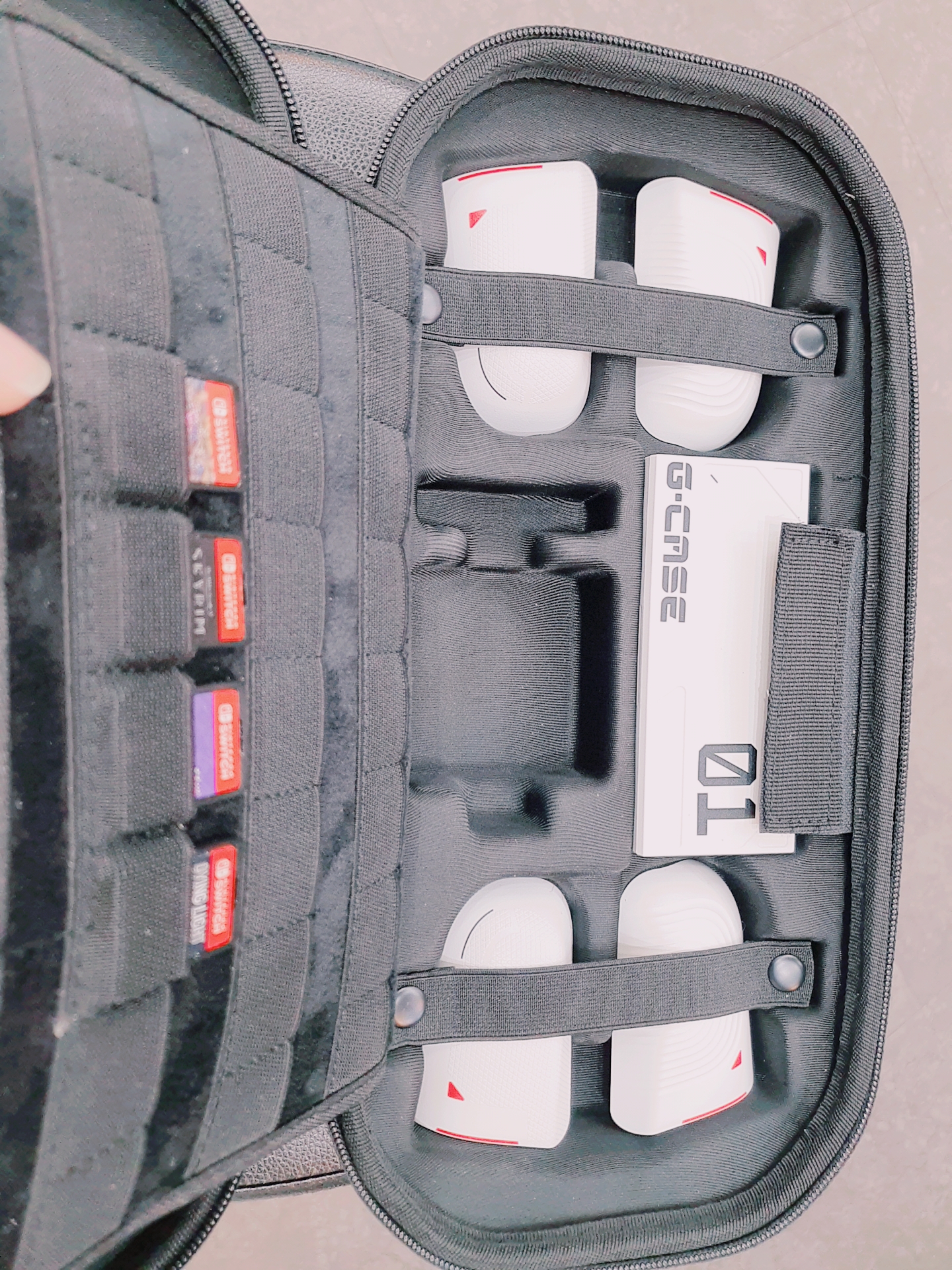 열어보면 크기가 상당히 큰 만큼 여러가지 들어갑니다. 케이스 장착한 스위치에, 예비 그립 네개에, 만약 패밀리팩을 구입했다면 예비배터리에 전용 독도 수납할 수 있습니다, 다만 저는 케이스 본품과 가방만 주문했지요.