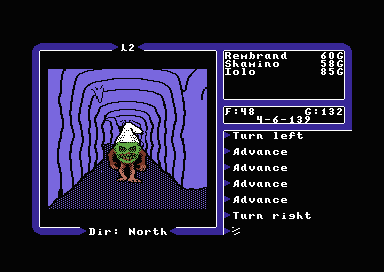 그리고 울티마에서 가장 던전탐험 같았던 5편의 던전 화면입니다. 누가봐도 동굴속을 탐험한다는 분위기가 물씬 나죠... 게다가 저기 보이는 그램린은 특히 짜증나는 몬스터였습니다. 약하긴 한데 떼로 몰려오고, 어쩌다 접근을 허용해서 한 대 맞으면 아프진 않지만 식량을 훔쳐가는지라... 후에 결국 식량이 없는데 돈도 없으면 급한대로 주변에 밭에서 농작물이라도 뽑아서 먹고다니면 로드 브리티쉬가 욕하게 되기 때문에... ㅎㅎㅎ 가장 던전 탐험하며 두근거렸던 게 울티마 5편이 아니었나 합니다.